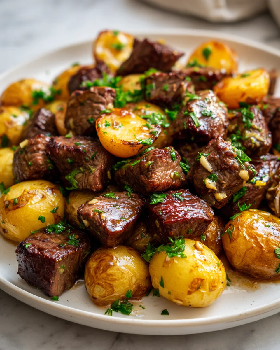Juicy Garlic Steak Bites & Crispy Potatoes Recipe