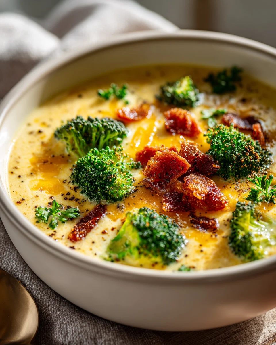 Savory Broccoli Cheddar Soup with Beef Bacon Crumbles Recipe