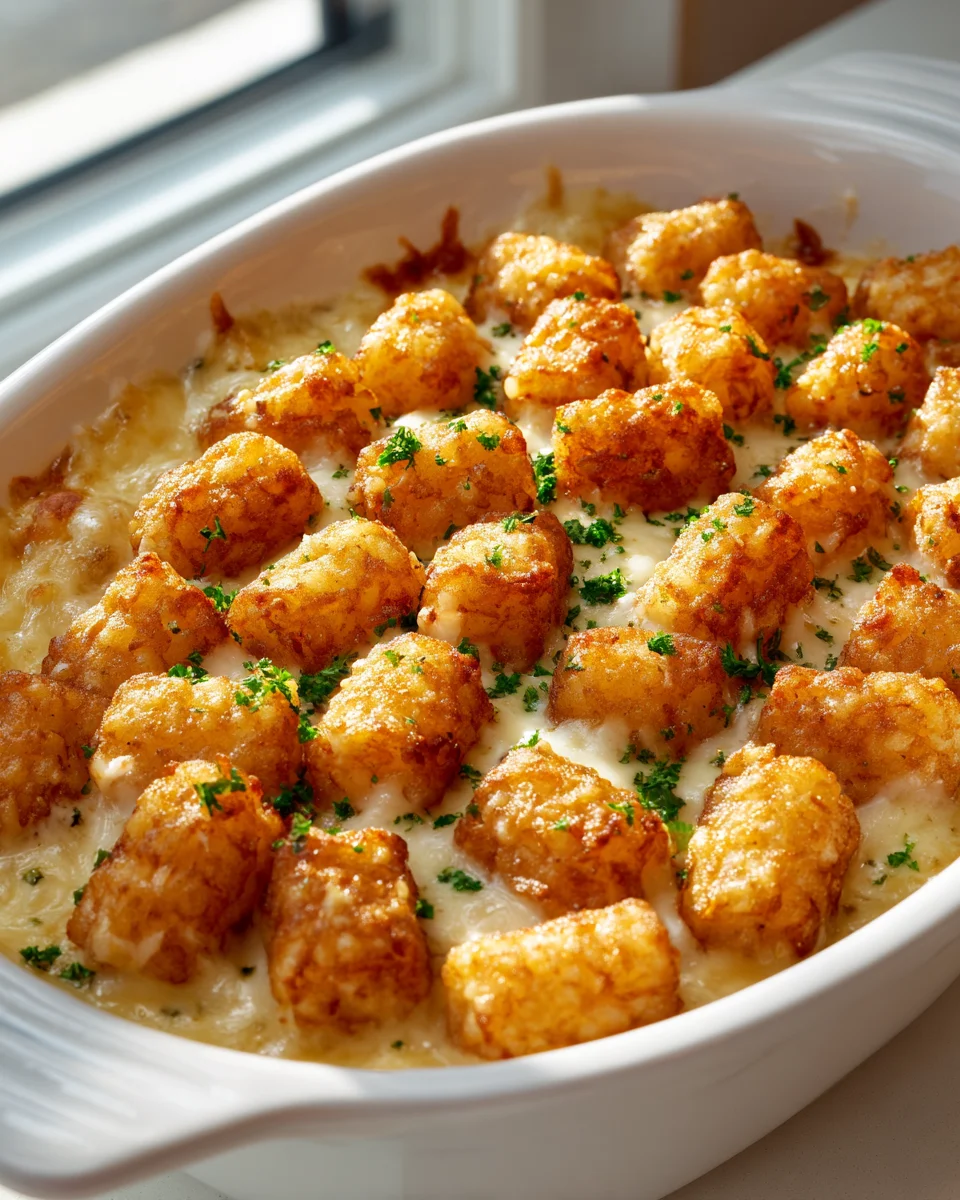 Hearty & Cheesy Chicken Alfredo Tater Tot Gratin