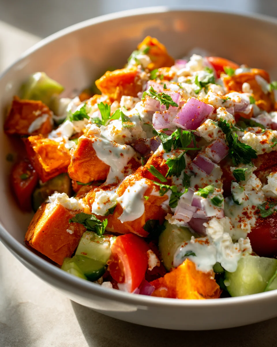 Mediterranean Sweet Potato Taco Bowl with Feta & Tzatziki