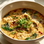 Dive into a steaming bowl of Thai Peanut Chicken Potsticker Soup, where cozy comfort meets bold flavors! This hearty soup features tender chicken potstickers, vibrant greens, and a rich, creamy peanut sauce.