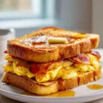 - Assemble the Sandwich: Take one warm slice of French toast, layer your cooked eggs, followed by the crispy beef bacon or sausage, and top with cheese. Optionally, drizzle with maple syrup or add hot sauce before topping with the second slice of French toast.