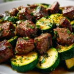 This Garlic Butter Steak Bites with Zucchini is a flavorful and nutritious low-carb dinner option. Juicy steak bites are seared to perfection and tossed in a rich garlic butter sauce, paired with fresh sautéed zucchini.
